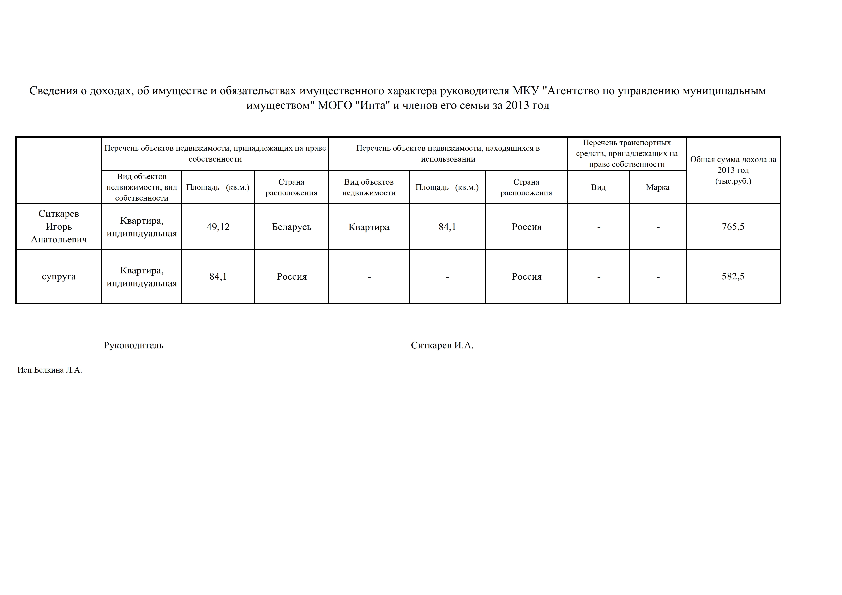 Сведения о доходах, об имуществе и обязательствах имущественного характера руководителя муниципального учреждения и членов его семьи за 2013 год