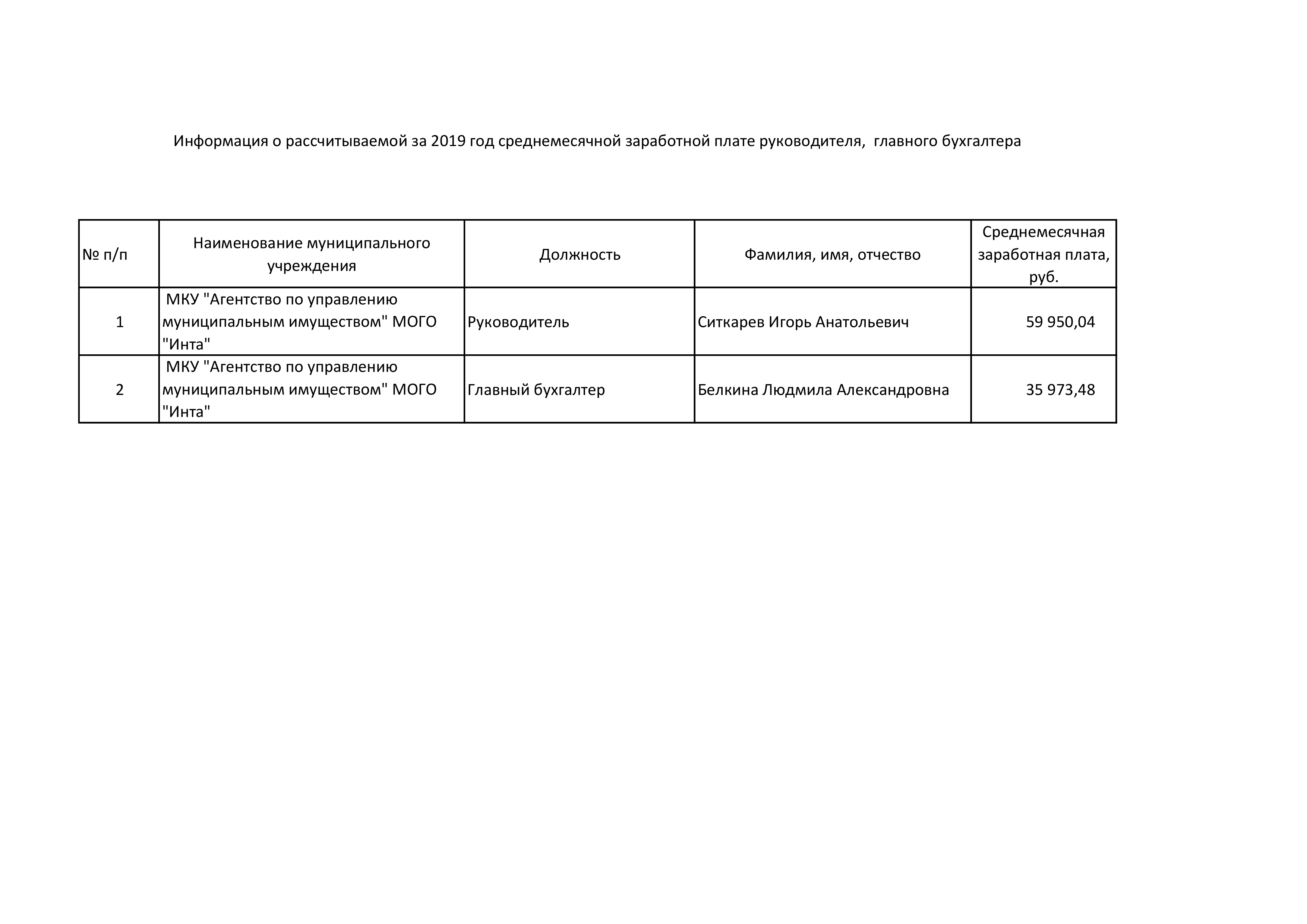 Информация о рассчитываемой за 2019 год среднемесячной заработной плате руководителя, заместителя и главного бухгалтера