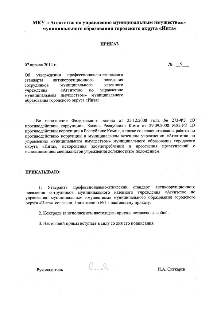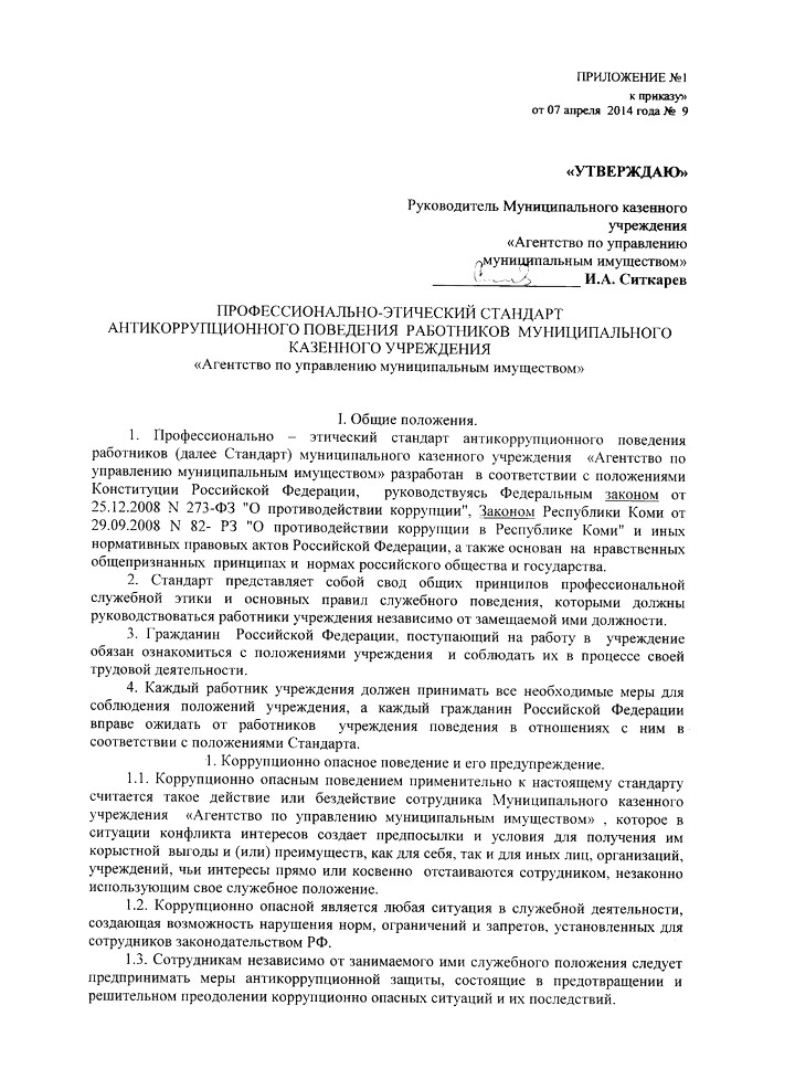 Приказ об утверждении профессионально-этического стандарта антикоррупционного поведения