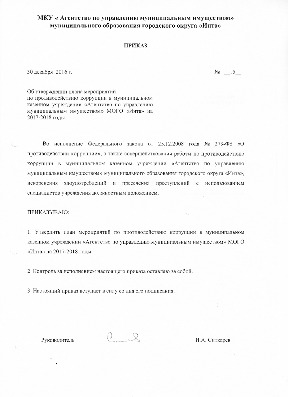 Приказ об утверждения плана мероприятий по противодействию коррупции на 2017-2018 годы