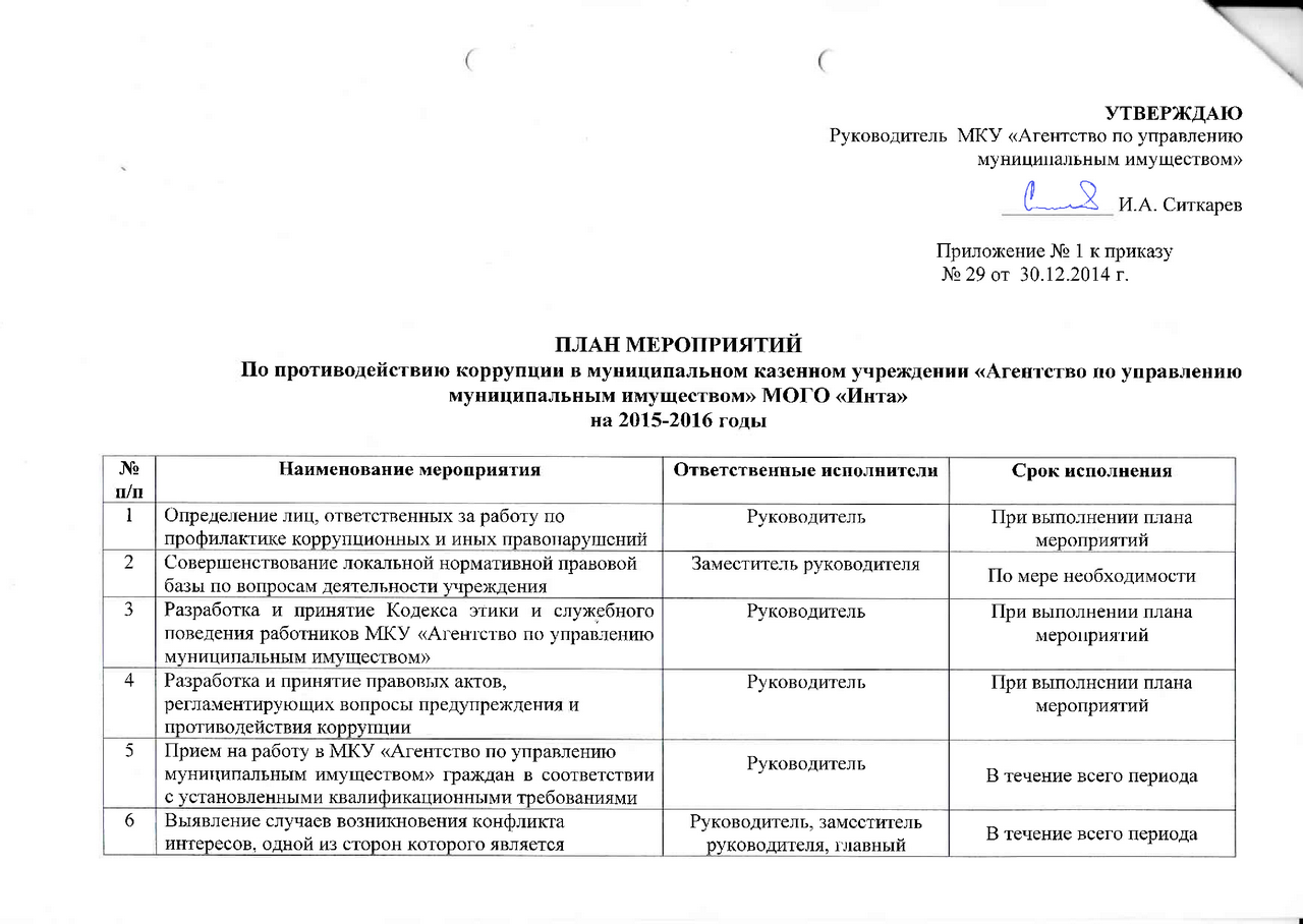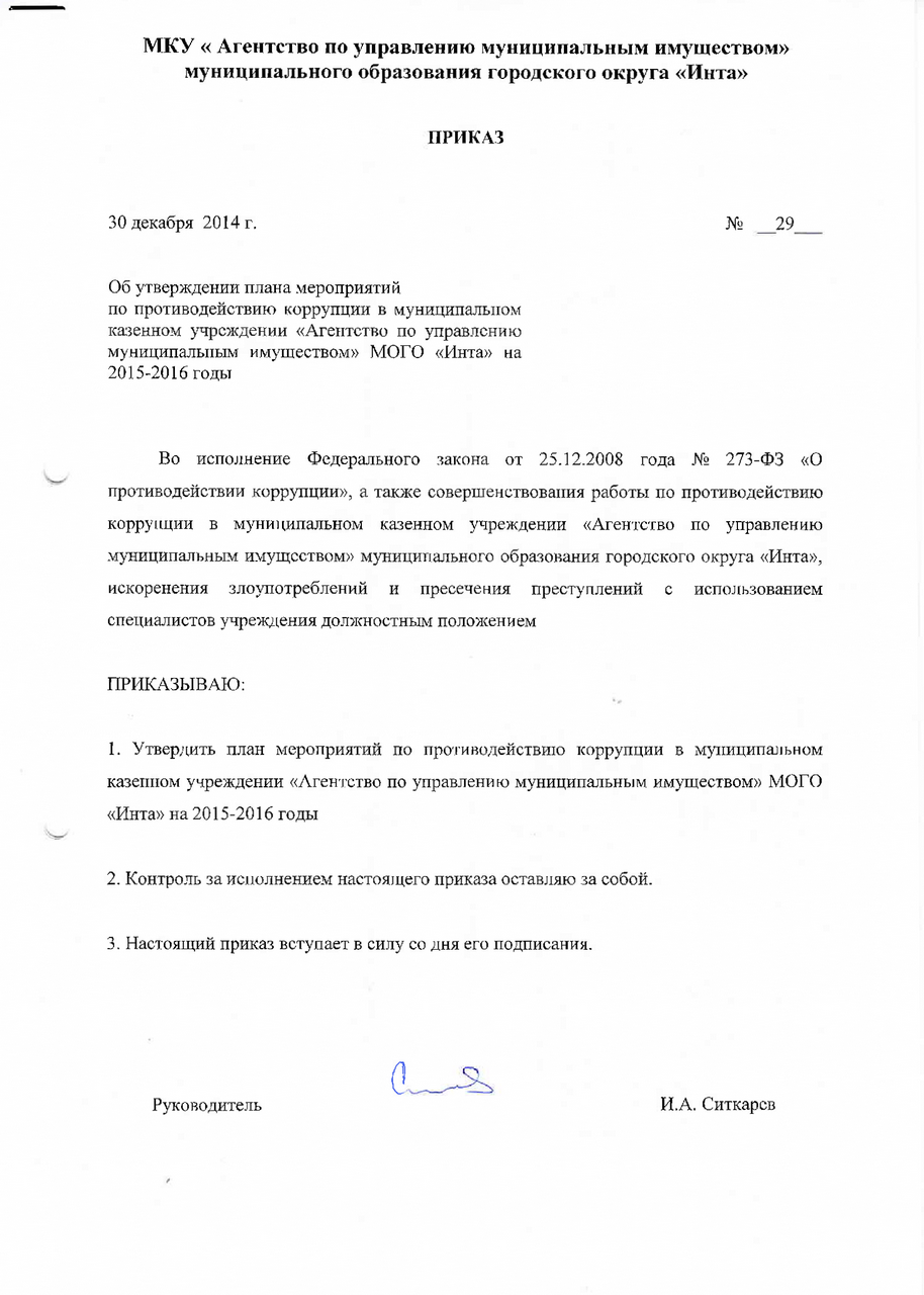 Приказ об утверждении плана мероприятий по противодействию коррупции на 2015-2016 годы