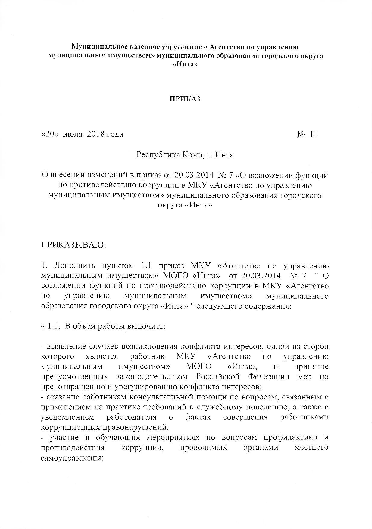 Приказ о внесении изменений в приказ от 20.03.2014 №7 "О возложении функуция по противодействию коррупции" от 20 июля 2018 года