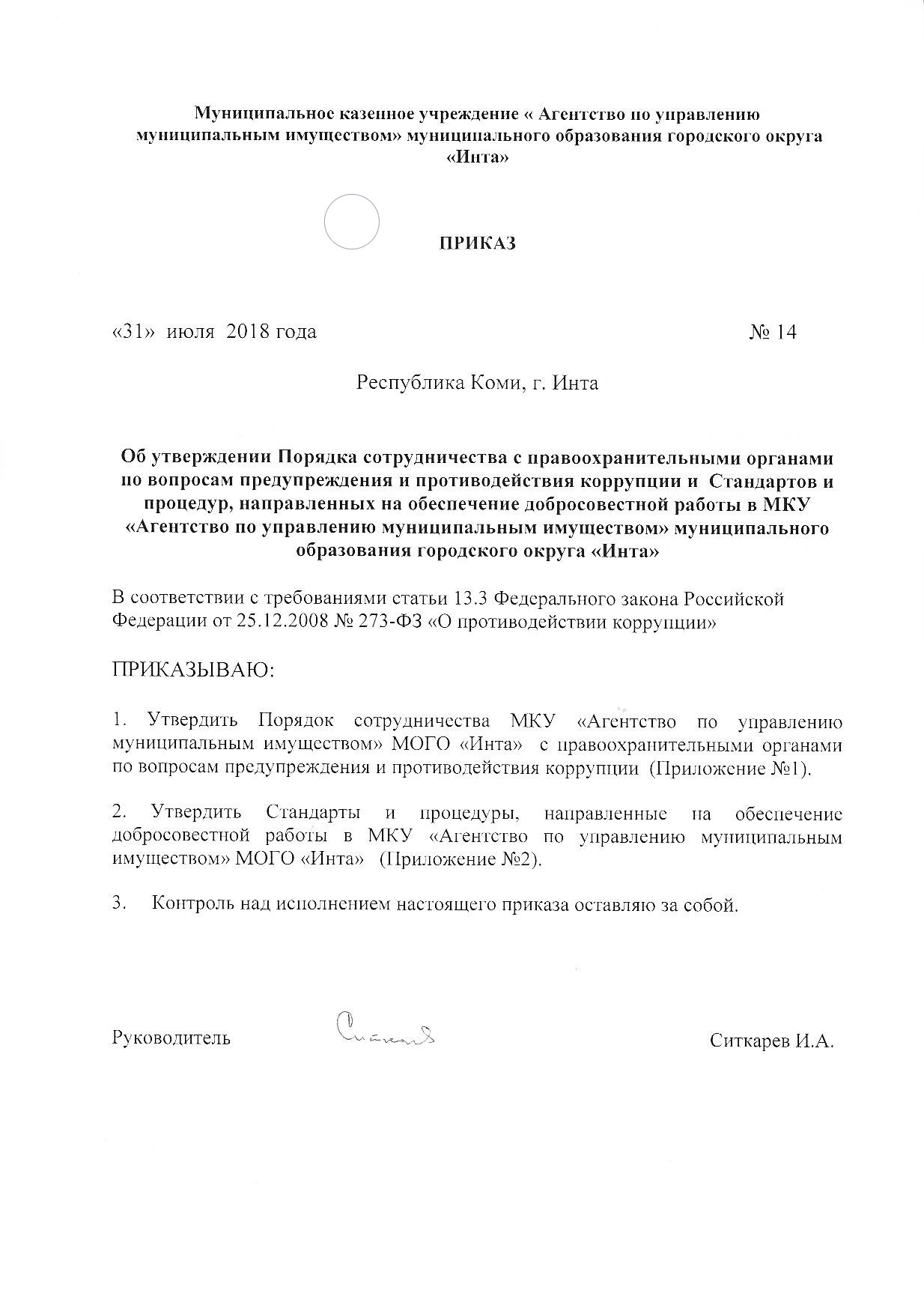 Приказ об утверждении Порядка сотрудничества с правоохранительными органами по вопросам предупреждения и противодействая коррупции и Стандартов процедур, направленных на обеспечения добросовестной работы от 31 июля 2018 года