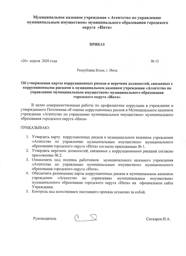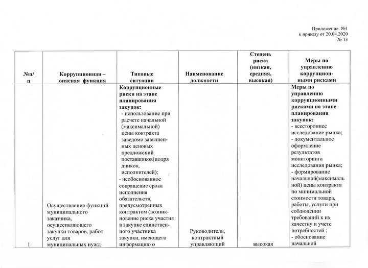 Приказ об утверждении карты коррупционных рисков и перечня должностей, связанных с коррупционными рисками